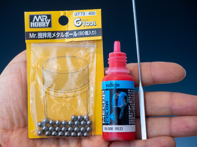 그런데 Vallejo 도료 용기는 입구가 좁고 조색 스틱을 넣을 수가 없어서, 그 대신으로다가 도료병 안에 이런 쇠구슬을 하나둘씩 넣어줬습니다. 쇠구슬 넣은 도료병을 한 1~2 분쯤 신나게 흔들어주면 그럭저럭 잘 섞이는 것 같습니다.