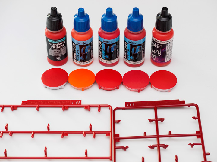 저는 채도가 높고 약간 오렌지 빛이 도는 빨강을 좋아하는데, Mecha Color 레드가 딱 그런 빨강이네요. 혹시나 조색에 필요할까 해서 Mecha Color 오렌지도 구입했는데, 빨간색 표현에는 굳이 섞을 필요 없을 듯합니다. SZ 레드는 사자비 용 빨간색인 듯한데(아마 상표권 때문에 '사자비' 대신 SZ로 한 듯), 사진에선 눈에 잘 안 띄지만 색이 좀 탁합니다. Game Air 블러디 레드 역시 색감은 좀 다르지만 탁한 빨강이고요. PGU 건담의 빨간색 2단계 톤은 Mecha Color 레드에 화이트 약간 섞고, 블러디 레드에 블랙을 살짝 섞어서 표현하면 될 것 같습니다.