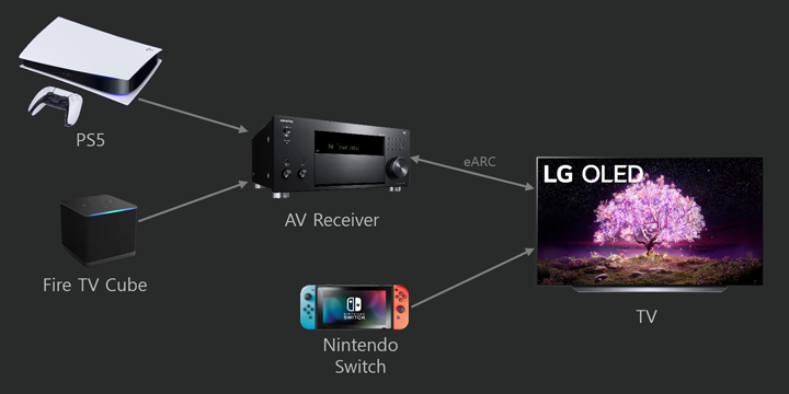 따라서 DTS 오디오 코덱을 사용할 가능성이 있는 소스 기기들은 TV 쪽이 아니라 AV 앰프나 사운드바 쪽에 달아줘야만 DTS, DTS-HD 음향을 플레이할 수 있습니다. 제 경우 PS5에서 영상 Blu-ray 디스크를 재생할 때, 또는 Fire TV Cube에서 동영상 파일 재생 시에 DTS 계열 코덱을 사용할 가능성이 있기 때문에 이들 둘은 AV 리시버 측에 물려줘야 했습니다. 게임기를 중간에 AV 리시버를 거쳐 TV에 연결하면, 기기 조합에 따라서는 게임에서 중요한 VRR (variable refresh rate) 기능이 제대로 동작하지 않는 증상이 있을 수 있는데, 저는 다행히 잘 되는 세팅을 찾았습니다 (온쿄 리시버에서 HDMI 입력 신호 포맷을 '8K Enhanced'로 설정). 반면에 닌텐도 스위치는 DTS와 아무 관련이 없고, TV 쪽에 물려주는 편이 조금이라도 더 입력 장치 전환이 편해지는 관계로 TV에 직접 연결해주었습니다.