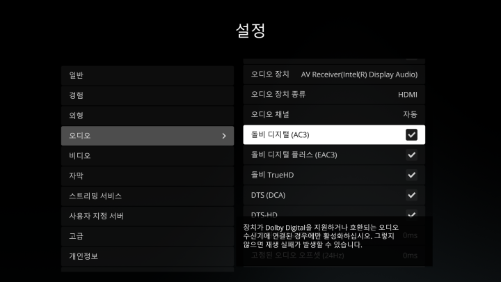 윈도우즈 PC의 동영상 플레이어 앱들 중에도 Dolby TrueHD와 DTS-HD pass through가 잘 되는 앱이 몇 가지 있는데요. Plex에서 최근에 나온 Plex HTPC(☞설치 페이지☜)가 꽤 괜찮더라고요. 얘 또한 pass through 설정 메뉴를 찾기가 쉽지는 않습니다. 일단 HDMI 케이블로 오디오기기에 연결한 상태에서만 설정이 가능한데요. 설정 > 오디오 메뉴에서 오디오 장치를 'AV Receiver'로 선택하셔야 하며, 그 아래에 나오는 Dolby Digital, Dolby TrueHD, DTS-HD 등등 모든 항목을 체크하시면 pass through가 활성화됩니다.