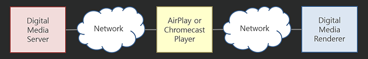 음악 전용 출력장치는 동영상 플레이어와 달리 디스플레이가 변변치 못하다 보니 서버 - UI기기(스마트폰 등) - 렌더러 형태의 연결이 필요한데요. 여기 사용되는 기술들은 대부분 3-Box Model이 아니고, 애플 AirPlay나 구글 Chromecast 같은 경우 음악 플레이의 주체가 스마트폰 같은 UI기기입니다. 우리가 NAS(서버)와 Hi-Fi amp(렌더러) 사이를 유선 LAN으로 연결해놨다고 가정해보죠. 그렇다고 하더라도 Chromecast나 AirPlay는 굳이 NAS의 음악 데이터를 스마트폰으로 Wi-Fi로 보낸 뒤에 스마트폰을 거쳐 음악을 트랜스코딩해서 또다시 Wi-Fi를 통해 출력장치로 보내주기 때문에, 음질 열화의 가능성도 있고 스마트폰의 파워도 잡아먹습니다. 반면에 진정한 3-Box Model에서는 스마트폰은 단지 컨트롤만 할뿐, 서버가 직접 보낸 데이터를 음향 출력기기가 그대로 받아서 플레이하는 형태이기 때문에, 효율성과 음질 측면에서 AirPlay나 Chromecast보다 더 낫습니다.
