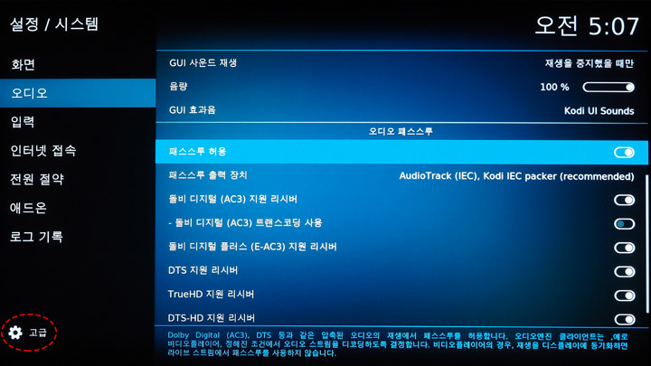 처음에는 소문처럼 동영상 호환성이 안 좋을까봐 걱정도 좀 됐는데요. 일단 대다수의 동영상이 Amazon Fire TV 버전의 Plex에서 잘 돌아가고 pass through도 잘 됩니다. Plex에서 문제가 있던 동영상 파일은 Kodi에서 돌리면 또 잘 됩니다. Kodi는 audio pass through 설정을 감춰놓아서 좀 헤맸는데요, 시스템 설정에서 아래 사진과 같이 좌측 하단의 설정 등급을 '고급'이나 '전문가'로 설정해야만 path through 코덱 종류를 지정할 수 있거든요. 여기서 'AC3 트랜스코딩 사용'을 제외한 모든 옵션을 켜줘야 합니다.