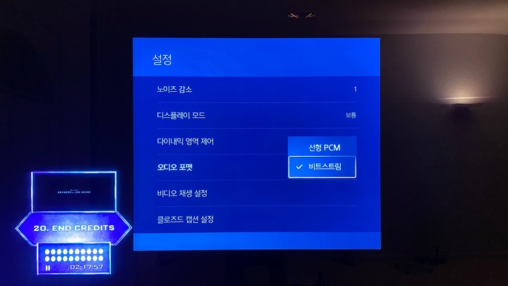 PS5에서 pass through 설정에 진입하는 유일한 방법은 Blu-ray 디스크를 플레이하는 도중에 듀얼센스의 옵션 버튼 (三 모양 버튼)을 누르는 것입니다. 그 때 화면 하단에 나오는 메뉴들 중 '⋯' 선택 후 '설정'으로 들어가면 되는데요. 아래 화면과 같이 중간에 오디오 포맷 옵션이 있는데, 여기서 '비트스트림'을 선택해야 AV 앰프나 사운드 바에 코덱 데이터를 그대로 보내줍니다. 그리고 Blu-ray 디스크의 초기메뉴 화면에서도 오디오 트랙을 Dolby Atmos나 DTS:X로 (보통은 1번 트랙입니다) 선택하셨는지 또한 꼭 확인하시는 게 좋겠고요.