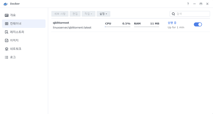 세팅 입력을 제대로 했는지 다시 한 번 훑어보시고 완료 버튼을 누르시면 qBittorrent 컨테이너가 만들어지고 바로 실행됩니다.